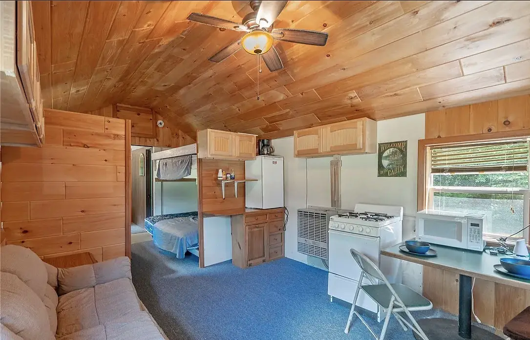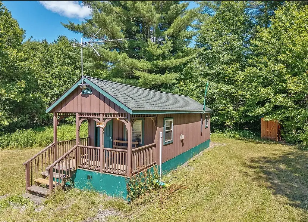 Among the towering mature trees there is a charming cabin-style camp that the property consists of. An entrance leads to an open living/kitchenette room that is modest and simple but totally functional. Also, there are bunk beds for sleeping and a wall furnace for warmness even on the chilliest nights. The whole arrangement couldn’t have been more perfect for short visits or hunting trip as well as long stays without any drastic changes.