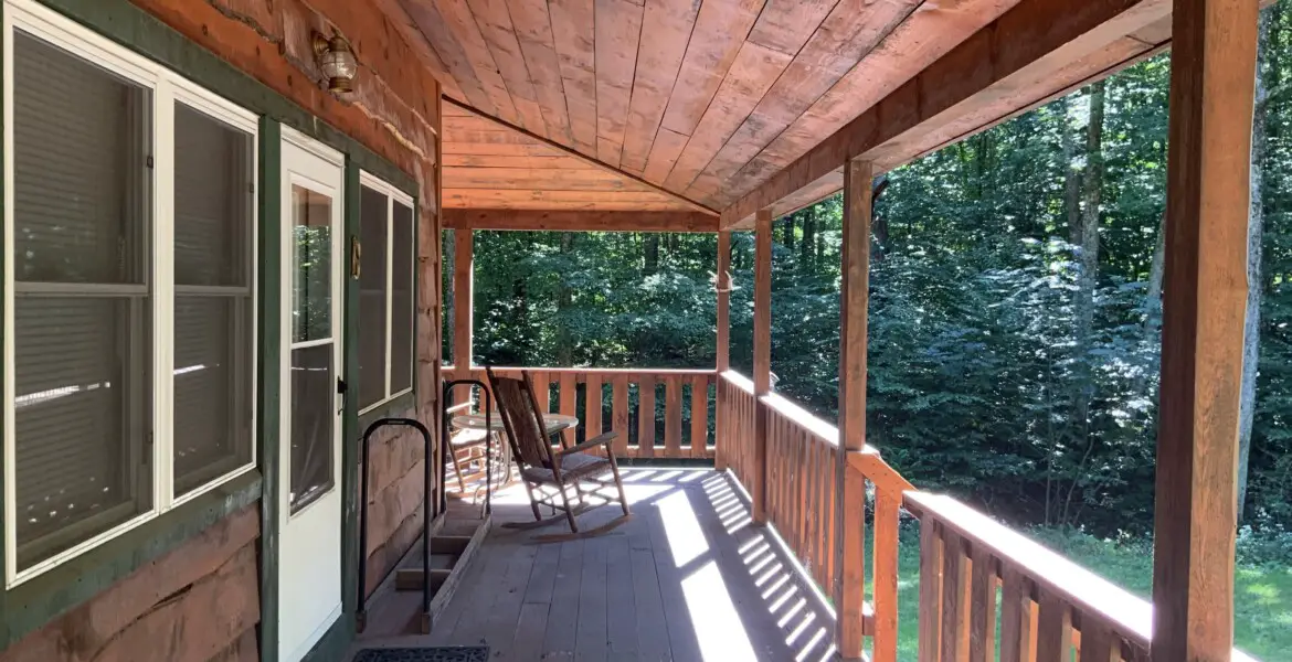 The cabin? An unbelievable 840-square-foot jewel made of six different trees cut down right there – the woods are literally the beams of the house! With wrap-around porches on two sides you have views of the forest and a yard that has been groomed down to grass. Also, in keeping with the vibe of the cabin, there are solar panels on the roof, a Honeywell generator with the shed, and any comfort you would think of a city house is here—except the utility bill.