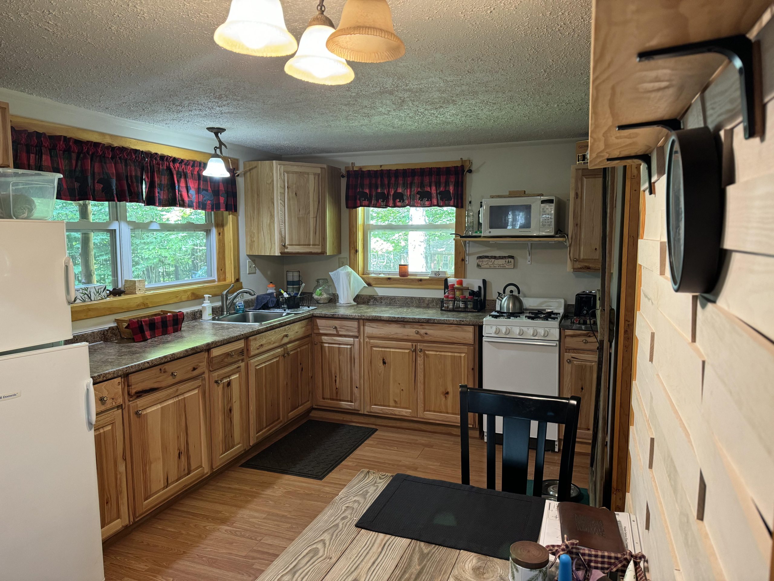 When you came inside the cabin, it was as if nature itself was giving you a warm hug. The living room and kitchen were open concept and thus making the cabin a very small yet warm and inviting place both for meeting with people and for quiet nights. On gas and wood, a dual-fuel fireplace provided warmth, and the crackling sound was a companion to cool autumn nights or snowy winter days. On the main floor, there was a comfortable bedroom as well as a full bathroom, which was equipped with all the necessities for daily living.