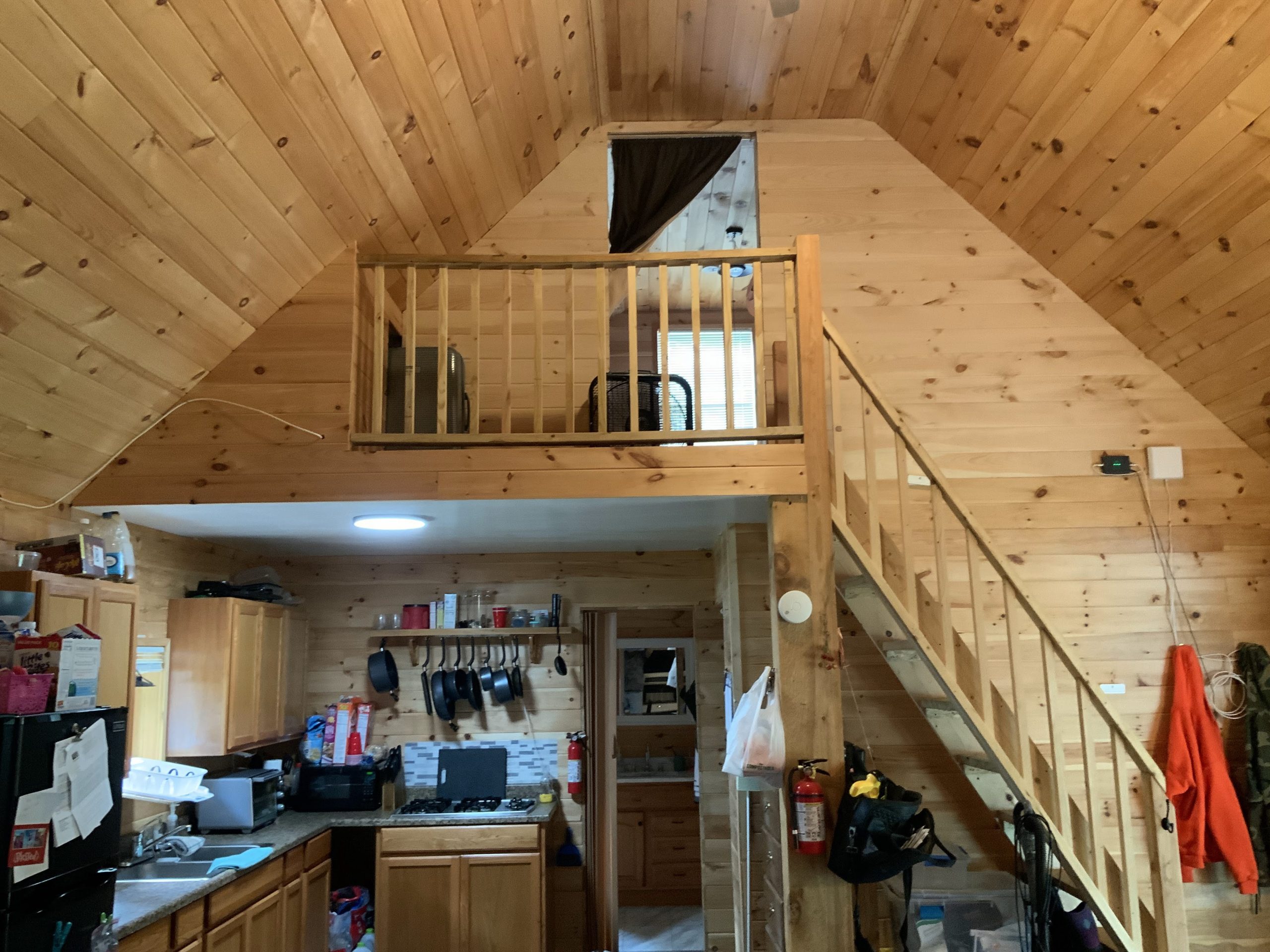 Enter the 20×40-foot wooden house that is located in the woods and you will be met with a warm embrace of knotty pine walls and trim that is typical for a cozy cabin. The cabin is fully insulated from the floor to the ceiling and, hence, it is suitable for year-round living be it a situation when you are heating the propane monitor heater on a cold November night or are opening windows to let the fresh air of a hot July day in. The house is designed very nicely: it has a large living area that can easily accommodate two or three sofas and armchairs for family gatherings and it is directly connected to a big kitchen which is furnished with a relatively new propane refrigerator and a propane stove. Prepare your post-hike stew or fresh-caught fish dinner here—there is a lot of space on the counter and hence, you will be able to complete your self-reliance task very easily.