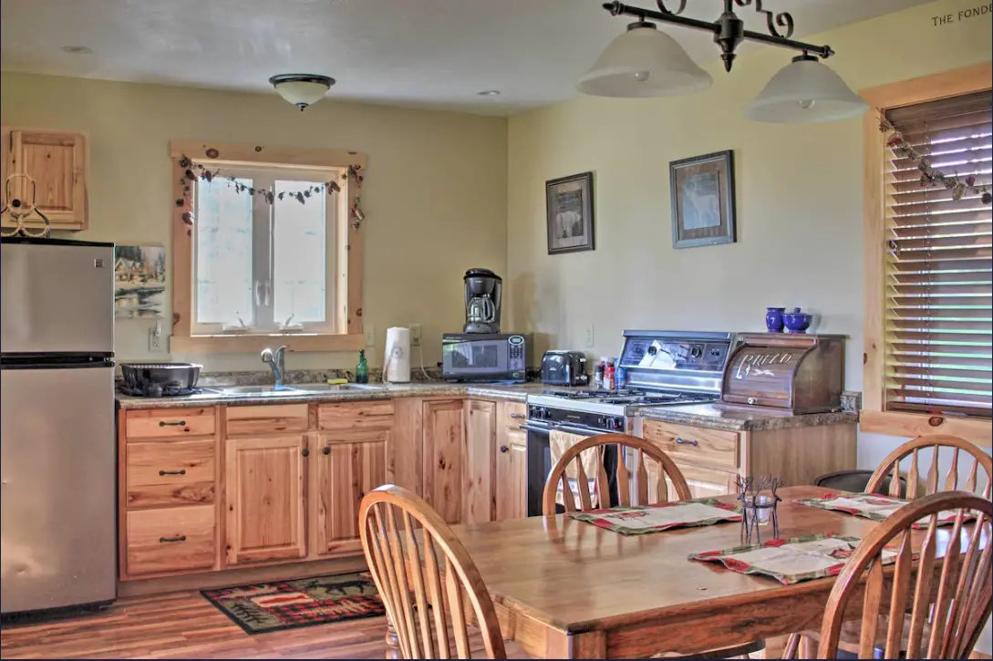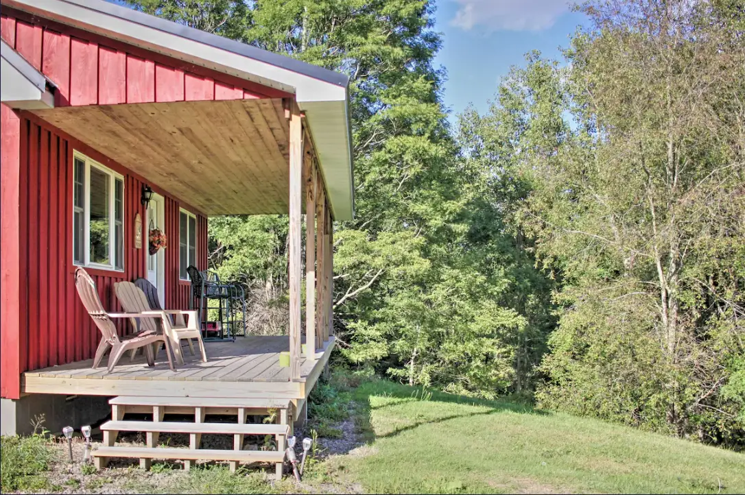 There is a large covered front porch that is the highlight of the outdoor living and it comes with the provision of seating – just the thing for sipping coffee while enjoying the views. The large tract of land is calling out to those who would like to get their exercise through walks and simultaneously, see if there are any visiting animals. In the cold season, the hill is converted into a place where one can have fun with sledding. Some more bonuses are-liable WiFi for the whole property, the provision of beddings and towels and an abundance of parking space on the site. As for pets, which are not referred to in the standard policies, it would be great if you could confirm your host’s approval before making any plans.