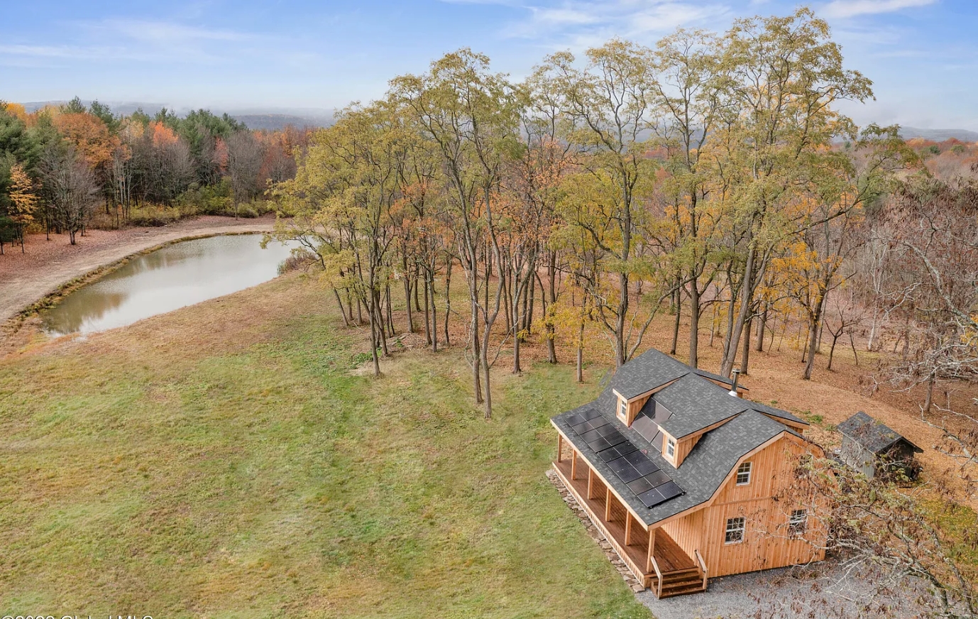 Nestled deep in the rolling hills of upstate New York, where the whisper of pine trees meets the gentle lap of a private pond, lies a property that feels like a page ripped from a nature lover’s dream journal. At 781 McMillan Road in Delanson, this one-of-a-kind custom Gambrel-style weekend cabin isn’t just a home—it’s a sanctuary. This off-grid jewel with 2 bedrooms, 1 bath, and a massive 1,600 square feet of carefully planned living space, was built in 2022 and is situated on a huge 182-acre lot with mountain views and absolute privacy. If you’ve ever dreamed of leaving the city behind for a life run by solar panels and heated by a wood stove, maybe this is the sign you were waiting for.