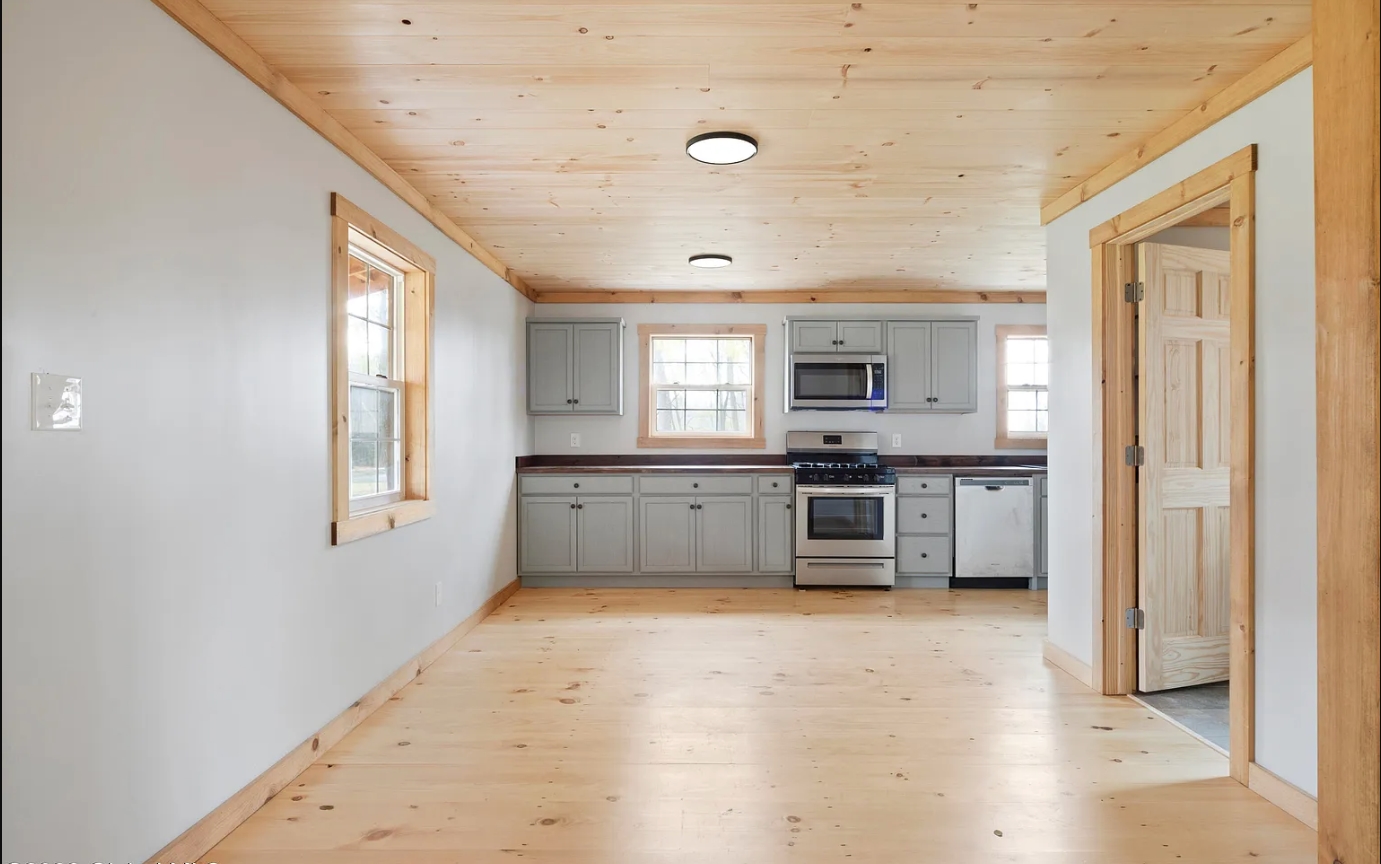 Once inside, the eye is drawn to the great room’s impressive use of natural wood throughout, where the workmanship is evident in every beam and board. This open, warm area is the core of the home, naturally connecting to a full bath and a sensible mudroom utility space. Laundry hookups here make post-hike chores a breeze, while the included appliances—dishwasher, microwave, oven, range, and refrigerator—ensure you won’t sacrifice convenience for your back-to-nature vibe.