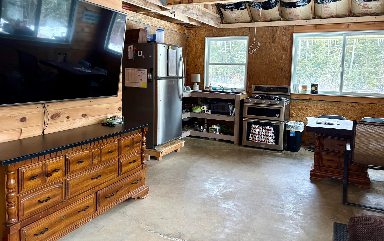 Built in 2020, this cabin feels fresh and modern while embracing classic Maine camp vibes. The warm, inviting layout centers on an open living area that combines kitchen, dining, and relaxation spaces—perfect for unwinding after a day outdoors. One comfortable bedroom provides private quarters, and the full bathroom adds everyday convenience.
