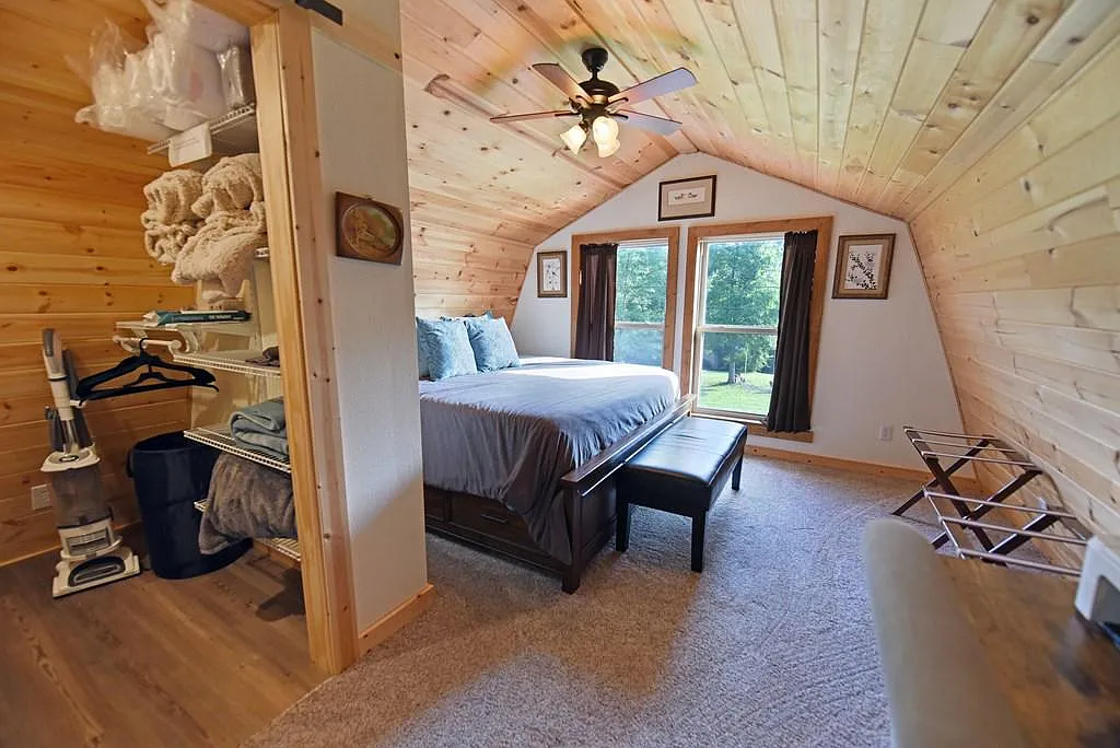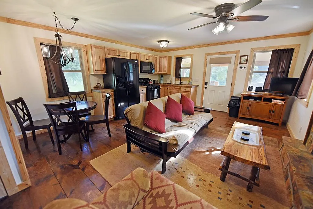 The cabin features a typical mountain style that includes wooden siding on a wooden-framed building, a sturdy metal roof, and a footing foundation that is all made to last. The interior 768-square-foot design offers a warm and comfortable feeling and at the same time, it is practical. It also consists of hardwood and laminate flooring which add up to the warmth and long-lasting nature of the floor. The presenting living/dining combo section is supported with the stone fireplace with the gas logs, thus the center for the lights or the quiet nights can be the gathering place. The use of wood in walls and ceilings intensifies the rustic style and at the same time, the ceiling fans and window treatments are practical solutions.