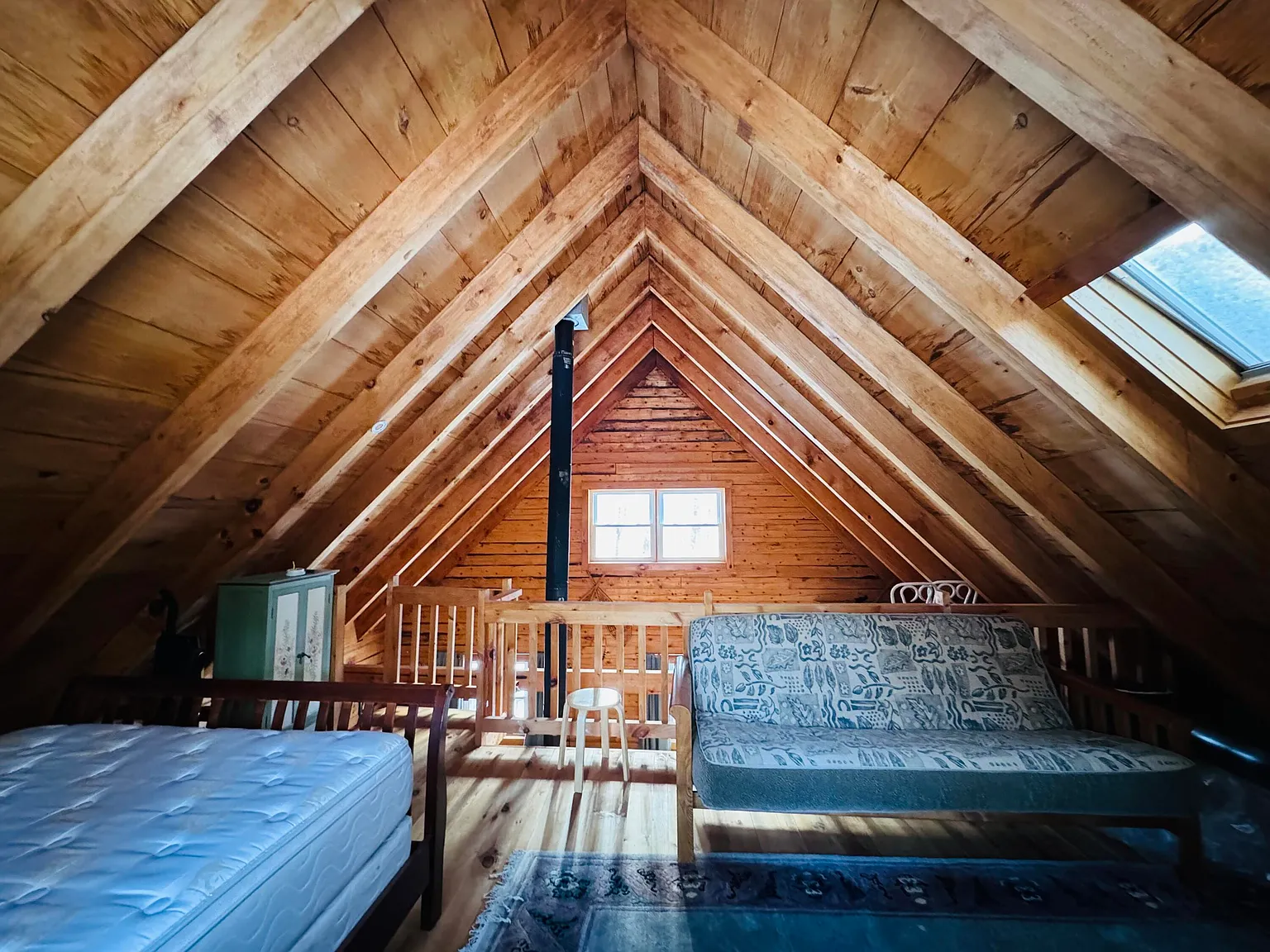 This single-story log cabin emphasizes self-sufficiency and simplicity. The open living area serves as the heart of the home, warmed by a reliable wood stove that provides cozy heat during Maine’s long winters. A spacious loft adds flexible sleeping or storage space, while the two bedrooms offer comfortable quarters for owners or guests.