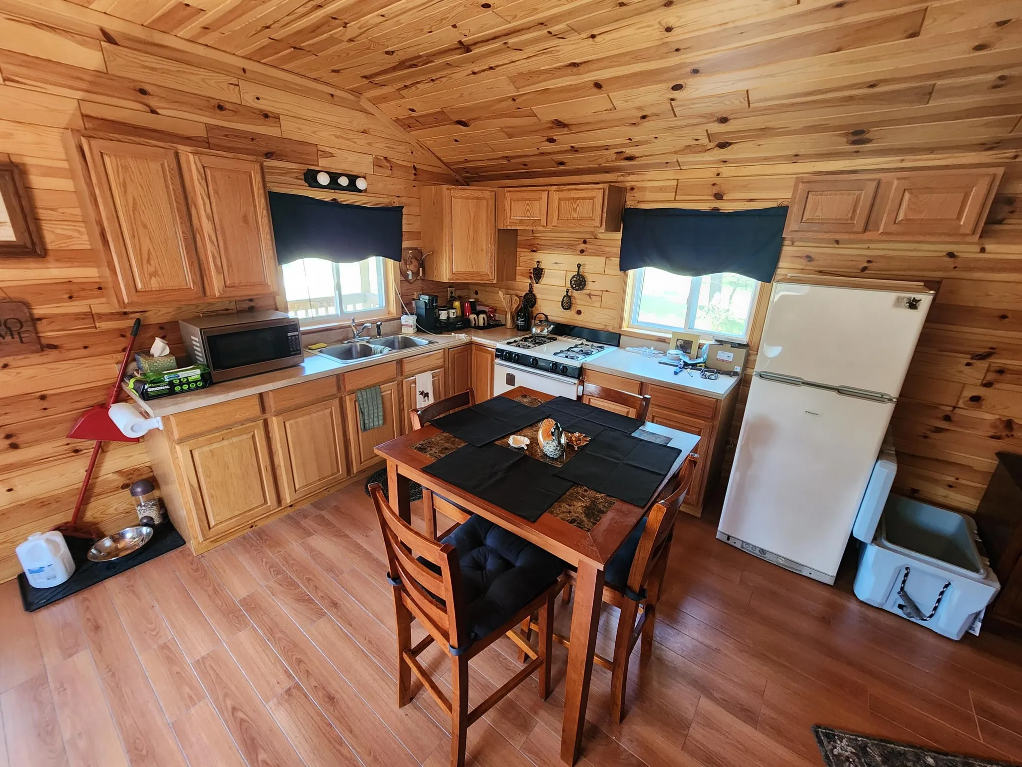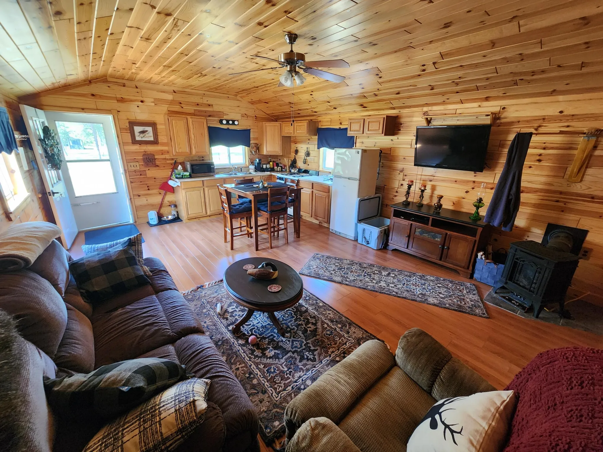 Built by Amish craftsmen, the cabin exudes quality and character. The interior features end-match knotty pine throughout—warm, textured walls that give the space a classic cabin feel—paired with vaulted ceilings that create an open, airy atmosphere despite the compact size. The open layout maximizes every square foot, with a cozy living area flowing into a functional kitchen equipped with an LP gas range and refrigerator.