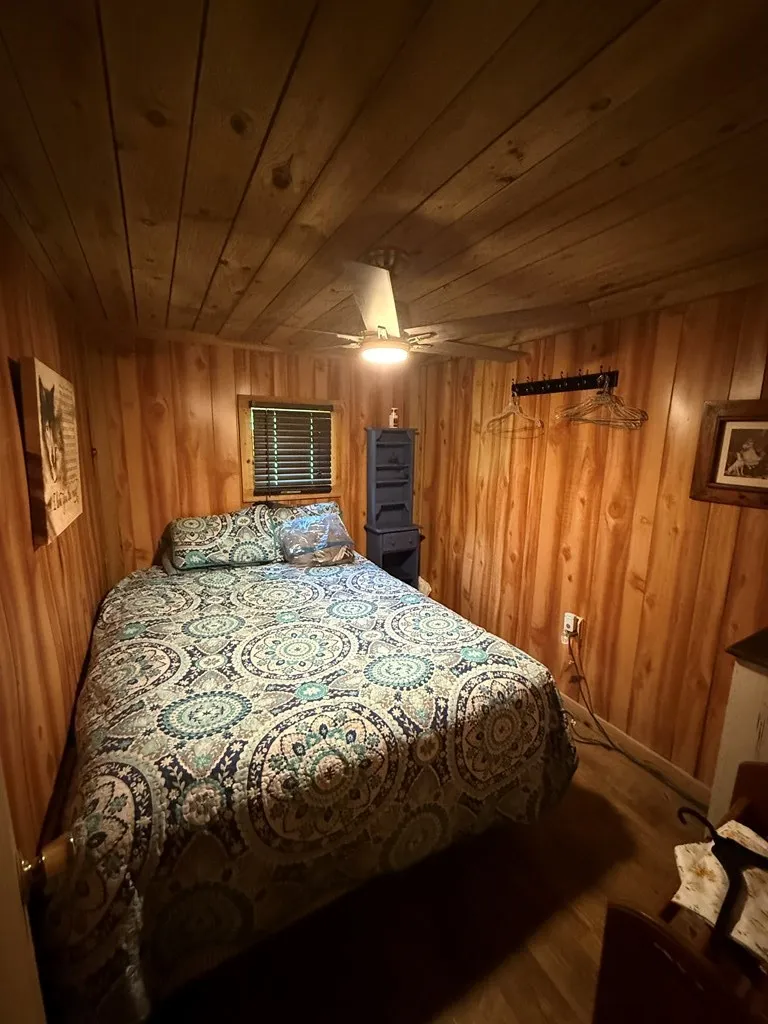 Built in 2000, this 1.5-story wood-sided cabin feels solid and welcoming. The main level includes a first-floor bedroom for easy access, while the open layout combines living, dining, and kitchen spaces efficiently. Hardwood floors add warmth and character, ceiling fans circulate air, and single-pane windows frame views of the surrounding woods and pond.
