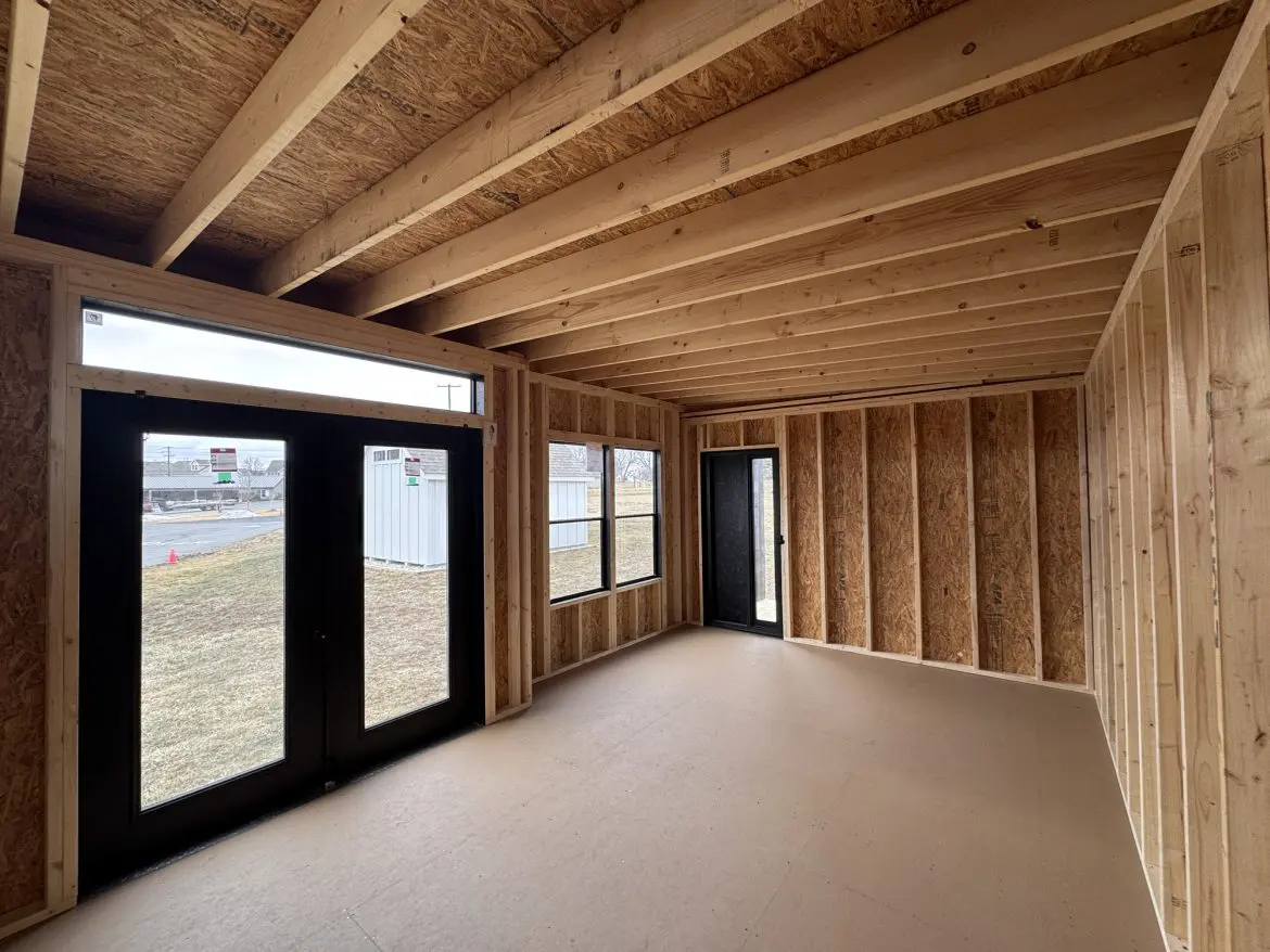 Inside, you’ll find a sturdy foundation on 4×4 pressure-treated skids and 2×6 floor joists spaced 16 inches on center, topped with smooth 3/4 tongue-and-groove flooring. Walls are framed with 2x4s at 16 inches on center, offering solid construction. The back wall stands at 92½ inches while the front reaches 98½ inches, creating a comfortable sense of openness.