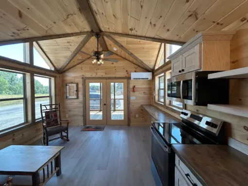 Right from the first time, you come face-to-face with the Smoky Mountain Cabin; its exterior is something that does not easily allow itself to be missed—like the middle of the peaceful wilderness from something closely related to the southern Appalachia Mountain range. This lodge, measuring 14 feet wide by 38 feet long, hits the right note of being neither too close nor too expansive with a total of living area (532 square feet) and that charming 10-foot screened porch to add on. The porch equipped with a ceiling fan to cool the evening air is definitely a point where people naturally come together after a day full of adventures to talk or just quietly look at the stars. You can either be hanging fairy lights or lighting the grill, it will be just the perfect time- magic personified as the day draws to a close.