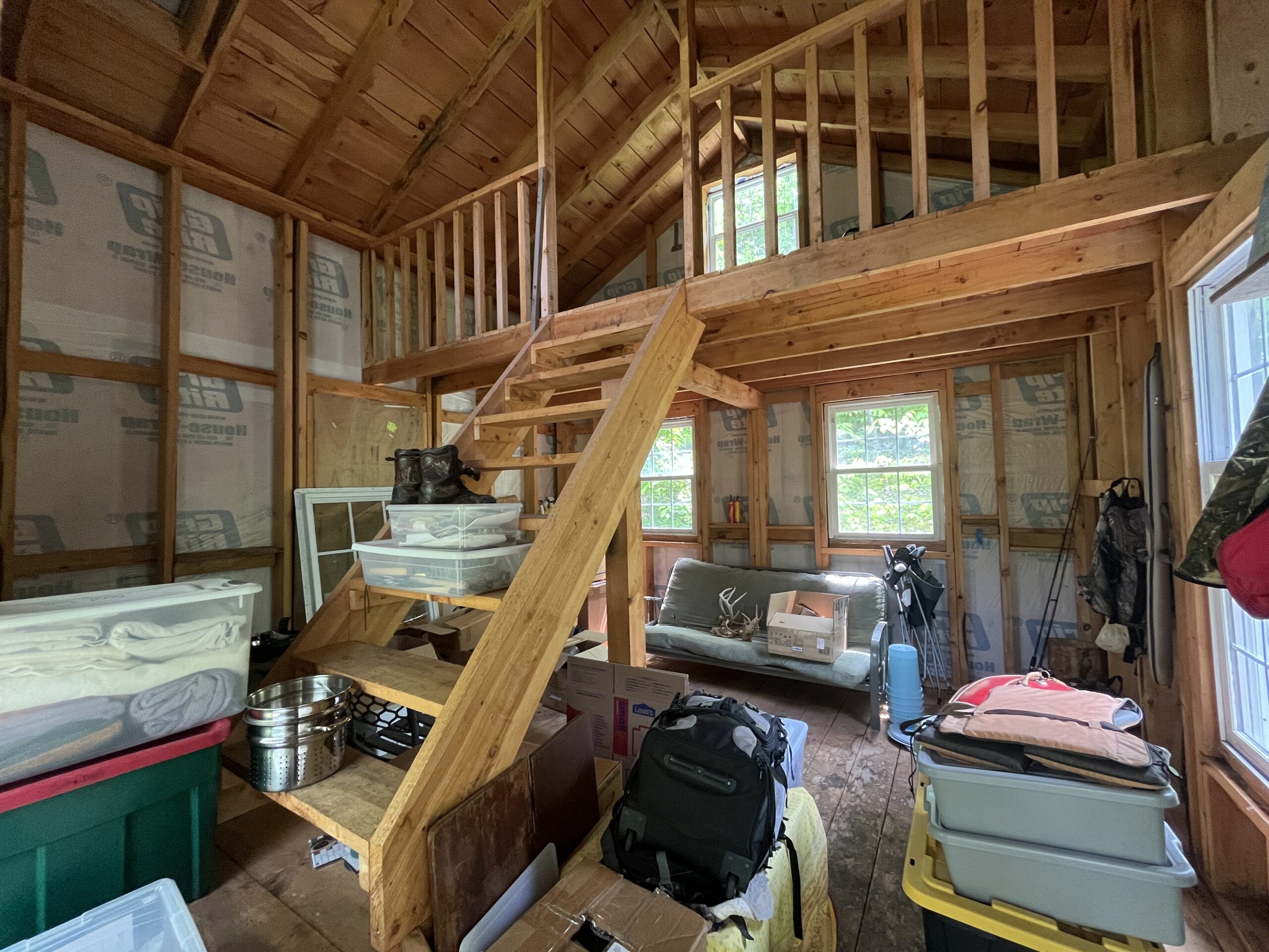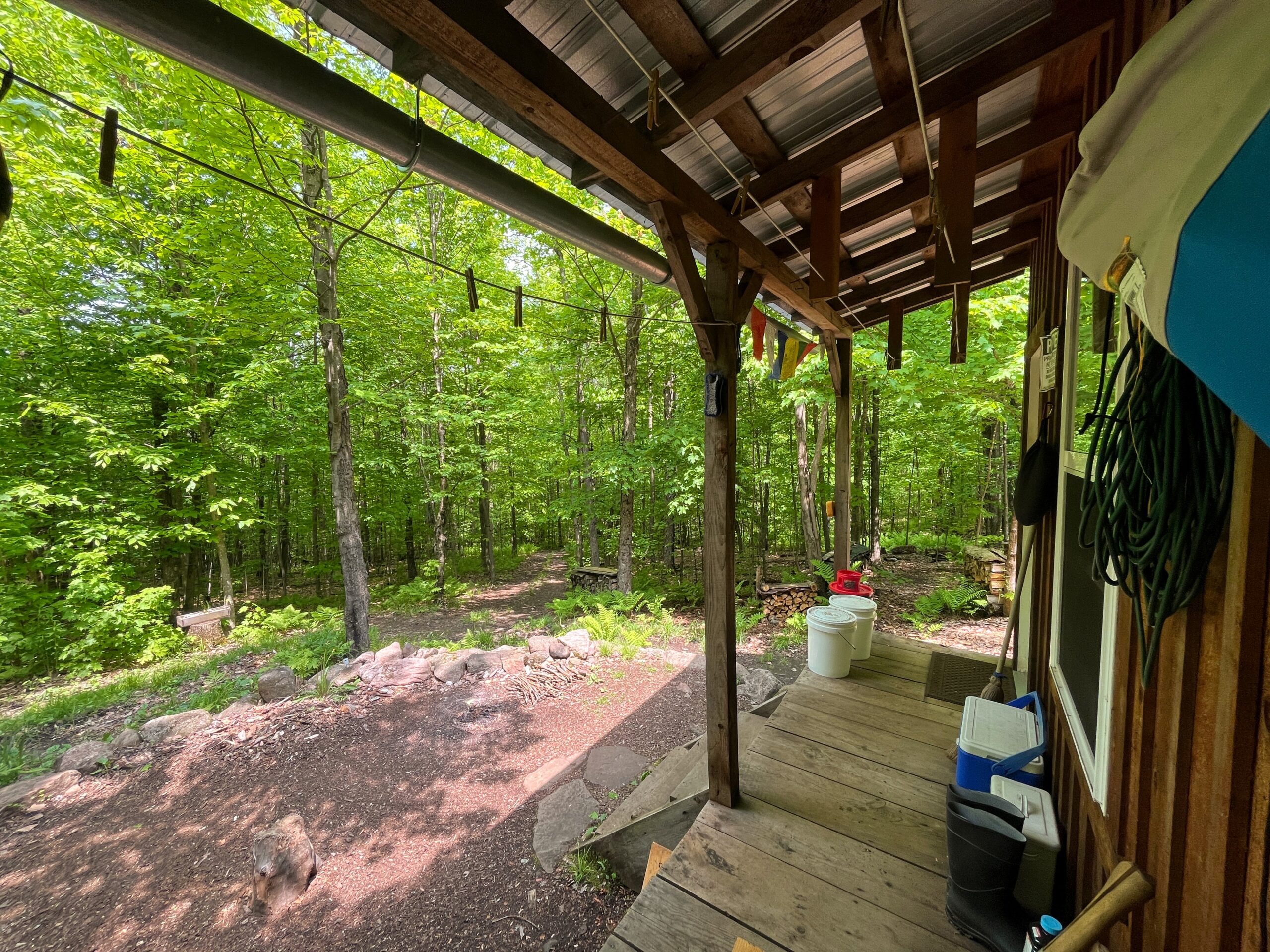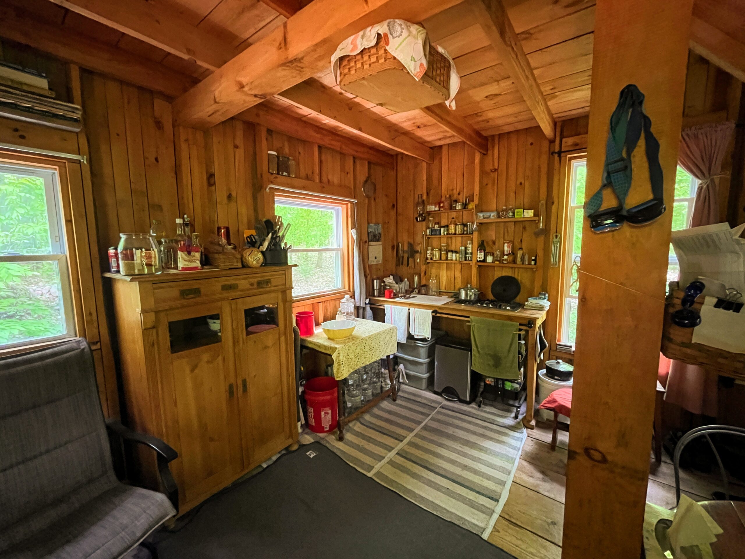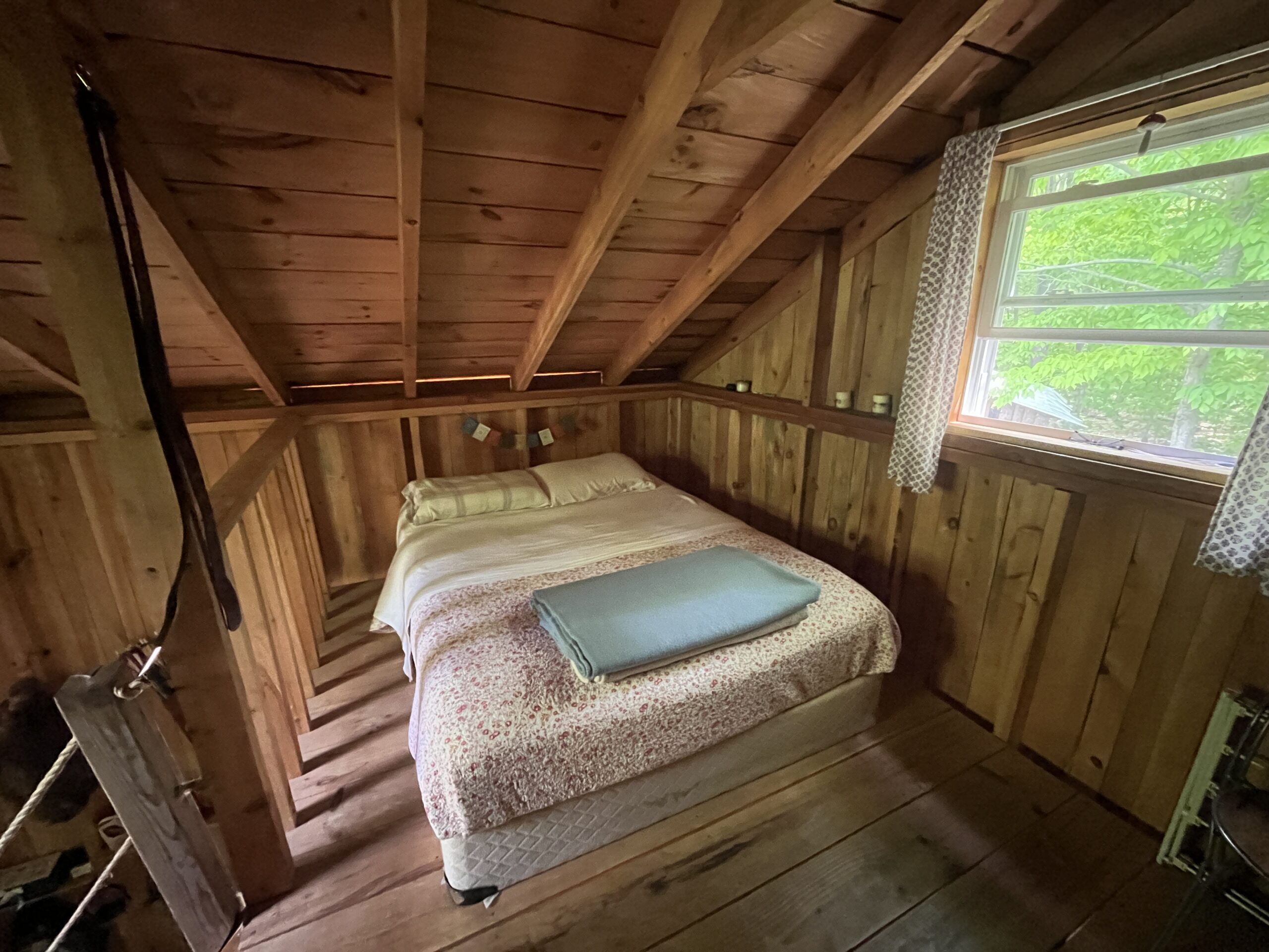 Approximately 300 feet away and situated further in the woods for complete privacy, is the guest cabin, a building with the same porch and sleeping loft arrangement but without the interior finishing. It’s there to entice you to: